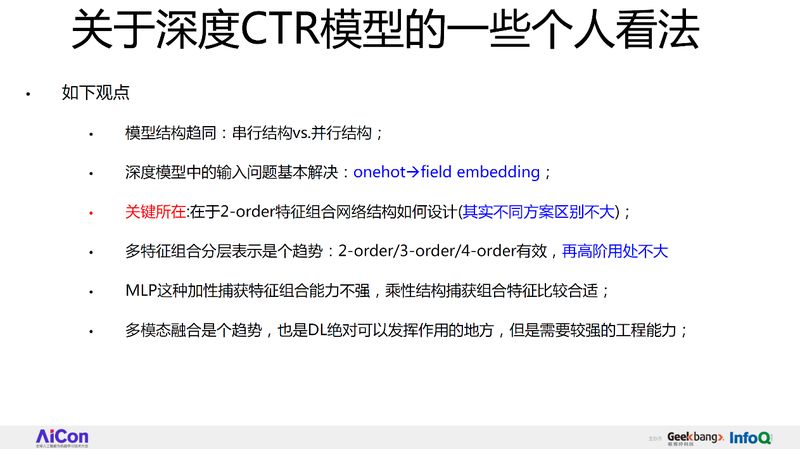 首先可以看到,现在所有的模型结构趋同,要么并行,要么串行,没有例外;第二,输入问题基本解决了,都是 onehot 和 embedding。核心所在是二阶特征组合怎么设计网络?所有的方法,或者大多数方法变化在这。另外就是多层,显式地做二、三、四阶,这是目前的一个趋势。