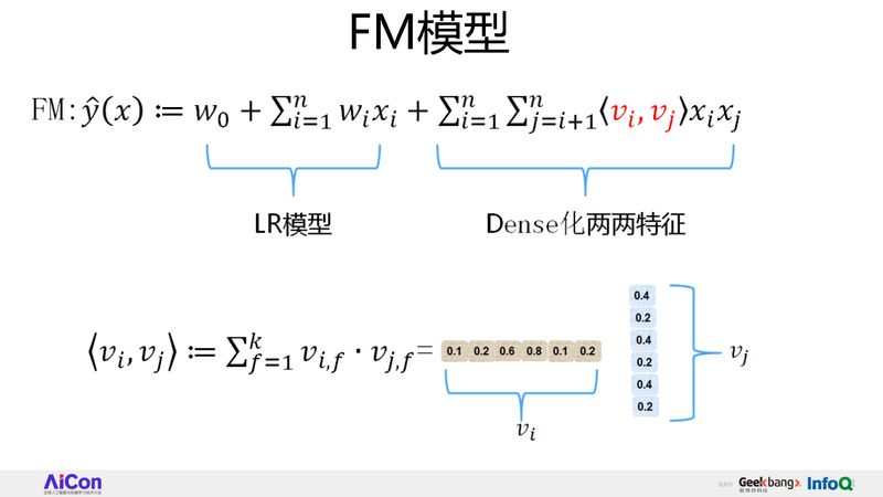 前面还是一样,就是 LR 模型,后面的也是任意两个特征组合,和刚才公式唯一的区别在:原先的 wi,j,换成了 vi 和 vj 的点积。vi 和 vj 又是什么含义呢?vi 的意思:对于 xi 这个特征来说它会学到一个 embedding 向量,特征组合权重是通过各自的 embedding 的内积呈现的,因为它内积完就是个数值,可以代表它的权重,这就是 FM 模型。