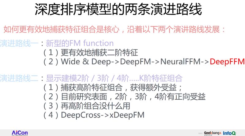 如果再归纳一下,你会发现深度排序模型,现在有朝两个研究路线在走。所有的模型在干什么?捕获特征组合是它的核心,这两条演进路线怎么走的呢?