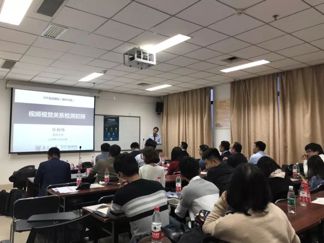 最后一位报告专家是任桐炜,他的报告主题为《视频视觉关系检测初探》。任桐炜首先向大家介绍了什么是视觉关系,然后介绍了其课题组在视频视觉关系检测中开展的初步尝试,包括视频视觉关系检测的任务描述、解决方案、评测基准等,并对视频视觉关系检测中存在的问题和进一步研究方向与大家进行了讨论。