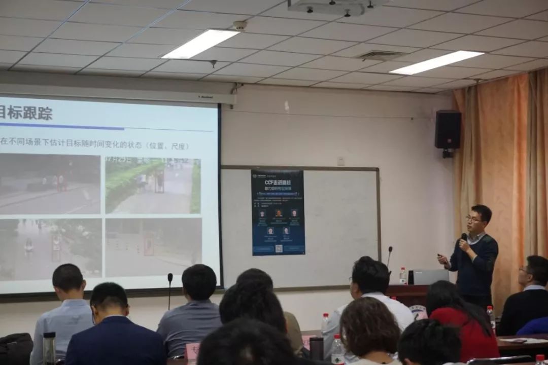 第四位报告专家是张天柱,他的报告题目为《目标跟踪算法研究进展》。张天柱提到目标跟踪是计算机视觉领域的热门研究方向之一,同时在产业界也具有广阔的应用前景。他首先带领大家回顾目标跟踪的研究进展,然后介绍一些代表性方法,如粒子滤波、基于分类器目标跟踪、稀疏跟踪、基于深度学习跟踪以及相关滤波等,最后介绍了其团队的相关研究成果。