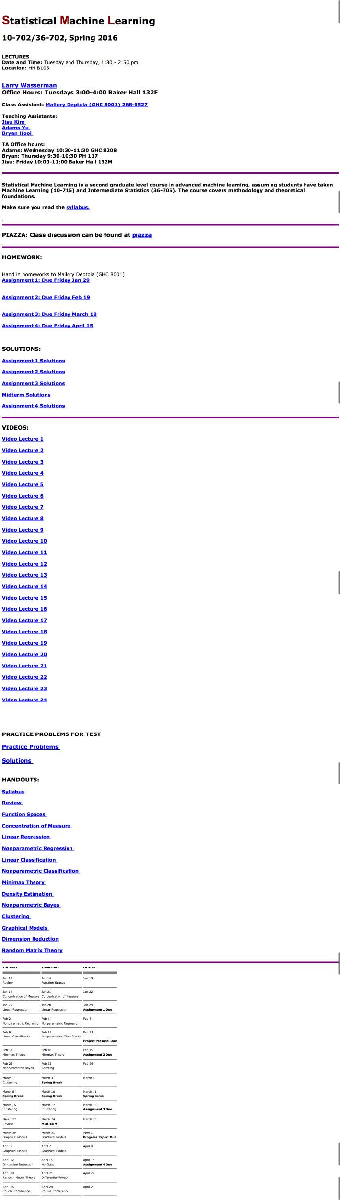 卡内基梅隆大学的《统计机器学习》2016年春季课程。统计机器学习是先进的机器学习的第2门研究生课程,假定学生已经修了机器学习(10-715)和中间统计(36-705)课程。课程内容包括方法论和理论基础。