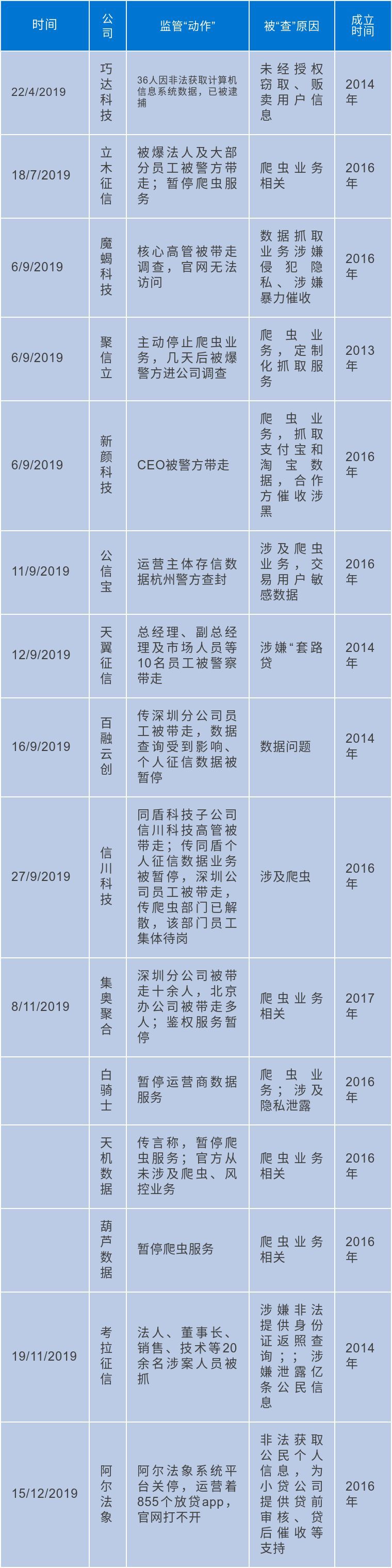 9 月 6 日,大数据智能风控服务供应商魔蝎数据被警方调查,一位核心高管被带走,官网至今无法正常访问;另一家大数据公司新颜科技的 CEO 黄向前也在同一天被警方带走调查;这天,聚信立发通知主动停止了爬虫业务,然未能幸免于“难“,仅过了几天后,聚信立被爆有警方进驻公司调查;9 月 11 日,知名币圈项目公信宝运营主体被杭州警方查封;次日,有媒体报道,集奥聚合深圳分公司十余人被带走,北京办公室也有多人被深圳警方带走;另有爆料称,天翼征信的总经理、副总经理及市场人员被警察带走。