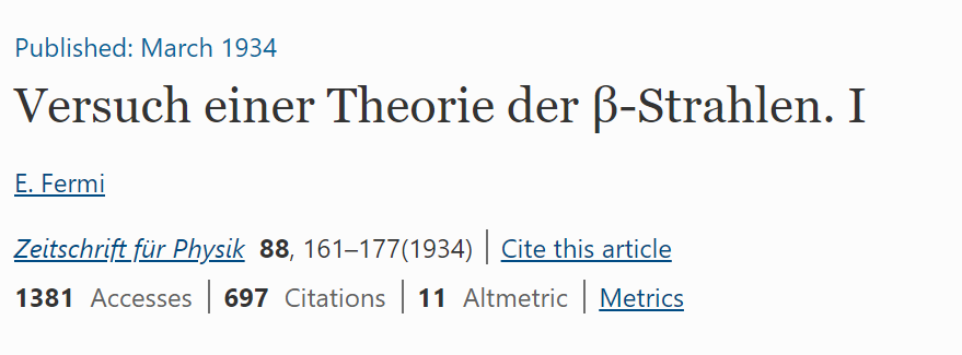 一起看看! 1. 玻色—爱因斯坦统计和凝聚,1924 论文:普朗克定律和光量子假设 (Plancks Gesetz und Lichtquantenhypothese) 作者:Bose, S. 期刊:《物理化学杂志-国际物理化学研究期刊》(Z. Physik) 摘要:玻色的论文,在这里被翻译成葡萄牙语,用爱因斯坦的话说是“到目前为止,这是一个重要的进步”。 关注光的量子理论的发展。虽然没有明确声明,但玻色认为,光量子(light quanta)是难以辨别的。 此外,他承认当时物理学界没有广泛接受的假设,即光子携带动量。他的论文启发了爱因斯坦在接下来的他的气体量子理论思路。 准确来说,整数自旋粒子的量子统计,与正文的玻色-爱因斯坦统计学是已知的。 1923年末,玻色向《哲学》提交了这篇论文。六个月后,期刊编辑告诉他,很遗憾评审给他的论文的反馈是负面的。 但他没有因此受到打击,将被拒绝的手稿寄给了爱因斯坦,后面的事情大家都知道了,爱因斯坦对这篇很感兴趣,并亲自将这篇收稿翻译后发表在Z. Physik期刊上,写道:“在我看来,这是向前迈出的重要一步”。 该篇论文主要是在普朗克的研究基础上,玻色引入了一个全新的统计方法,将两个硬币向上抛起,会得到正反、反正、反反、正正,也就是说两个硬币同时朝上的面相同的概率为1/4。 然而玻色提出全同(占据量子态)的光子是没有正反和反正的区别,所以只会有三种状态:正反、反反、正正。而该概率则下降成1/3。 参考链接:https://tu-dresden.de/mn/physik/itp/tqo/ressourcen/dateien/lehre_dir/vorlesungen_dir/ws_2012_2013/folder-2012-12-21-5820555304/bose_1924.pdf?lang=de 2. 弱相互作用(β衰减),1933 论文:关于β辐射理论的尝试 (An attempt of a theory of beta radiation) 作者:Enrico Fermi 期刊:《物理化学杂志-国际物理化学研究期刊》(Z. phys)摘要:本文提出了一种β衰变的定量理论,其中假设了中微子的存在,并用类似于辐射理论中从激发原子发射量子光的方法,来处理β衰变时原子核的电子和中微子的发射,推导了连续β辐射谱的寿命和形状公式,并与以往经验进行了比较。 费米相互作用(Fermi’s interaction):关于弱相互作用的早期理论,把弱相互作用看做是一种参与作用的四个粒子(如中子衰变中的中子、质子、电子和中微子)之间的点相互作用。 《自然》的编辑称,论文存在与现实相距太远的猜想,而使读者不感兴趣。 费米在1926年曾提出费米统计理论,与前文的玻色-爱因斯坦统计的玻色子理论正好相反,根据Ricerca Scientifica, 1933年(也是Z. Phys。1934年)的“ Tentativo di una teoria dei raggiß” 提出了一种关于ß射线发射的理论。 该理论基于保利首先提出的关于中微子存在的假设,费米因其在中子产生的人工放射性以及慢中子引起的核反应方面的研究工作而获得1938年的诺贝尔物理学奖。 在罗马的职业生涯的早期,他致力于解决电动力学问题以及对各种光谱现象的理论研究。 但是,当他将注意力从外部电子转移到原子核本身时,一个资本性转折点出现了。1934年,他发展了ß衰变理论,并结合了Pauli的中微子思想与辐射理论相结合。 居里和乔利奥特(Curie and Joliot)于1934年发现了人工放射性之后,他证明了核转化几乎发生在受到中子轰击的每个元素中。这项工作导致在同一年发现了慢中子,从而导致了核裂变的发现以及元素周期表以外元素的产生。 1938年,费米无疑是最出色的中子专家,他到达美国后继续从事这一主题的研究,不久他被任命为纽约哥伦比亚大学的物理学教授(1939-1942年)。 参考链接:https://en.wikipedia.org/wiki/Fermi's_interaction#History_of_initial_rejection_and_later_publicationhttps://www.nobelprize.org/prizes/physics/1938/fermi/biographical/ 3. 克雷布斯循环(克氏循环),1937 论文:柠檬酸在动物组织中间代谢中的作用(The role of citric acid in intermediate metabolism in animal tissues) 作者:Krebs, H, Johnson, WA 期刊:《酶学》(Enzymologia)摘要:在本文发表的前十年间碳水化合物的厌氧发酵分析已经取得了很大的进展,但当时人们对碳水化合物的氧化分解的中间阶段仍知之甚少。 本文报道了一些实验,为碳水化合物氧化的中间阶段问题提供了新的思路。结合前人已完成的工作,新实验使我们能够概述动物组织中糖氧化的主要步骤。 Hans Krebs称,他的论文在五天后就被《自然》退稿了,还附了一封当时很正式的拒绝信。 这是他发表了五十多篇论文之后,职业生涯中第一次被拒。在《酶学》发表克雷布斯论文的前一年,《自然》发表了对《酶学》的欢迎语,称《酶学》正是其当下非常关注的! 在1918年至1923年之间,他在哥廷根大学,弗赖堡-布雷斯高大学和柏林大学学习医学。在柏林大学第三医学诊所工作一年后,他于1925年在汉堡大学获得医学博士学位,然后在柏林学习了一年的化学。 1933年6月应弗雷德里克·高兰·霍普金斯爵士的邀请,他去了剑桥生物化学学院,直到1934年,他被任命为剑桥大学生物化学助理研究员。 1938年,他被任命为谢菲尔德大学生物化学系的讲师。1954年,他被任命为牛津大学惠特利生物化学教授,医学研究理事会细胞代谢研究部门被转移到牛津。 克雷布斯教授的研究主要涉及中间代谢的各个方面。他研究的主题包括哺乳动物肝脏中尿素的合成,鸟类中尿酸和嘌呤碱的合成,食品氧化的中间阶段,电解质的主动转运机制以及细胞呼吸之间的关系。并生成多磷酸腺苷。 在他的许多出版物中,有一篇关于生命物质能量转换的杰出研究报告,于1957年与HL Kornberg合作出版,探