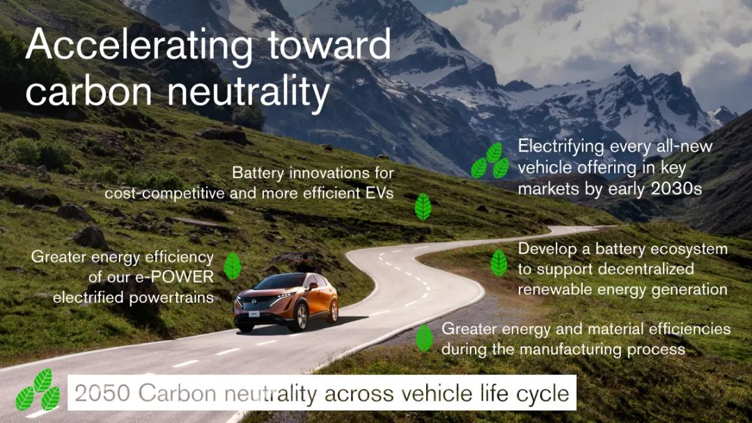 实现交通领域的碳中和,是日产在内的众多车企孜孜以求的目标。今年一月,日产提出了“向碳中和加速”的战略。到 2030 年,我国碳排放达峰目标实现的同时,日产主要市场的新车型将完全电气化;2050 年,国内制造的日产全系新车将实现全寿命周期碳中和,助力我国 2060 年实现碳中和的宏伟目标。