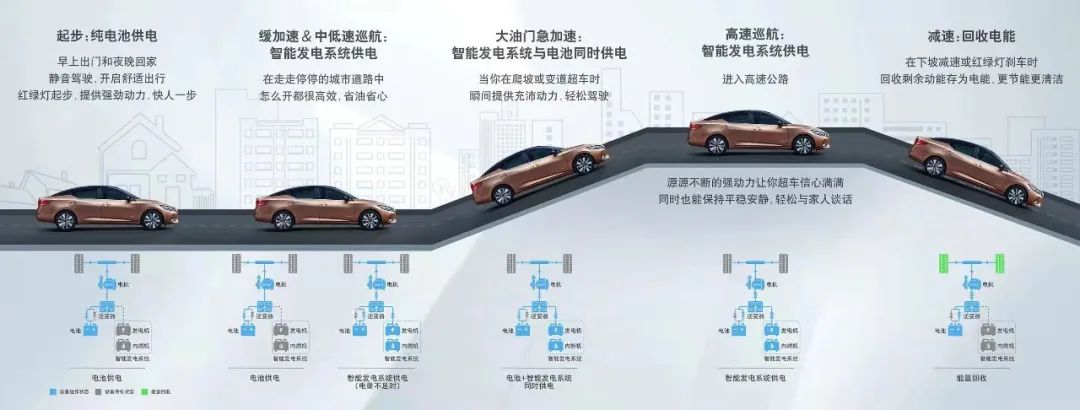 车辆启动与中低速运行的时候,电池向驱动电机供电,发动机处于休眠状态,搭载 e-POWER 的车辆此时与电动车无异。如果功率需求进一步增大,例如高速巡航或电池电量低时,内燃机将被唤醒,同时向驱动电机和电池功能。如果功率需求再增大,电池将和内燃机一同工作,系统可用功率达到最高。e-POWER 的工作逻辑,让内燃机工作时间比油电混动系统缩短 50%。
