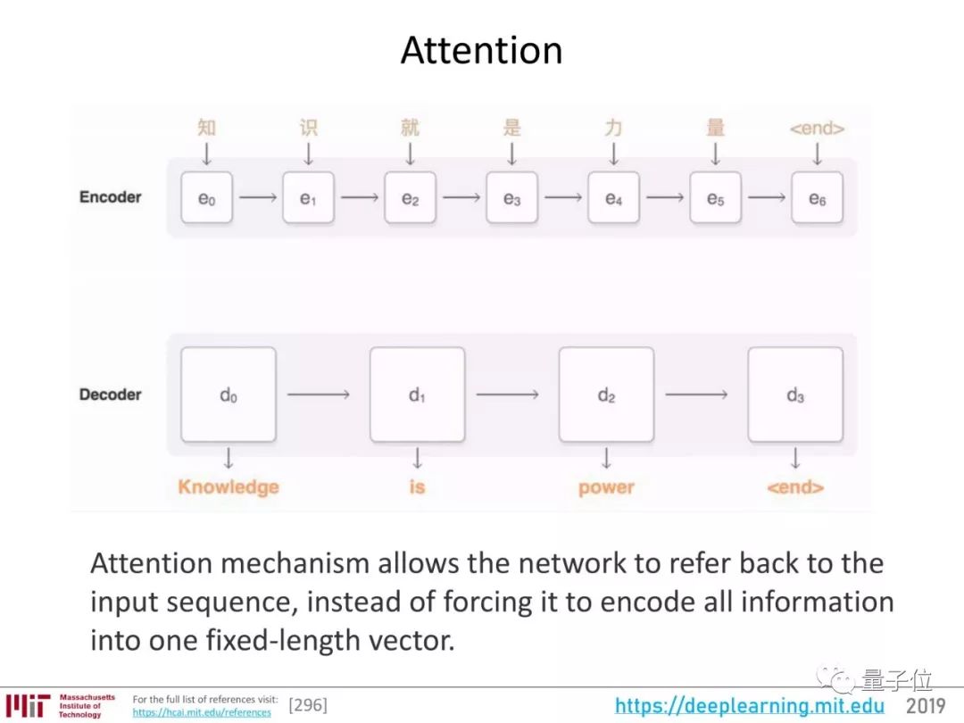 接下来发展出了注意力(Attention)。这种机制,不强迫网络将所有输入信息编码城一个固定长度的向量,在解码过程中还能重新引入输入序列,还能学习输入序列和输出序列中哪一部分互相关联。