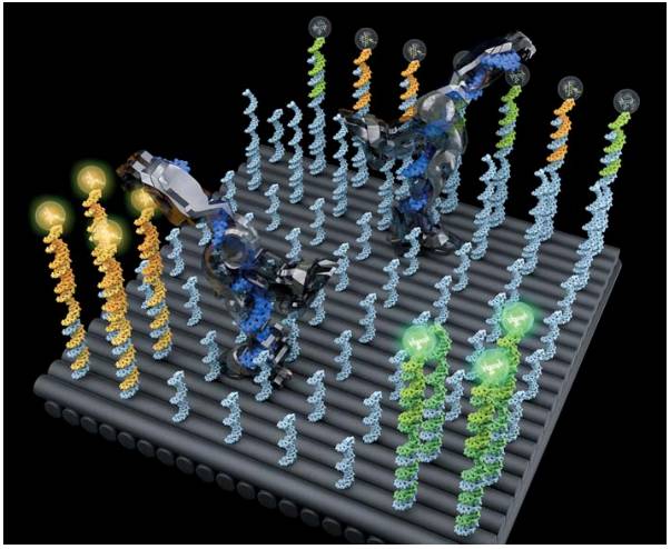 在一个 58 纳米长、 58 纳米宽的场地上,DNA机器人大约需要一天的时间来探索整个测试场地。一路上,当机器人遇到拴在桩子上的货物分子时,就会用“手”抓住货物(分子货物连接在和手的碱基互补的单链上),然后继续行走,直到遇到放下货物的信号。这个过程虽然很慢,但一个简单的、消耗很少能量的机器人可完成这个看似复杂的任务。