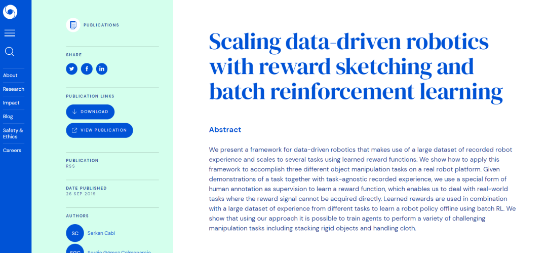 DeepMind研究了一个数据驱动的机器人框架,该框架使用大量的机器人体验数据集,然后使用学习奖励函数将其扩展到几个任务。