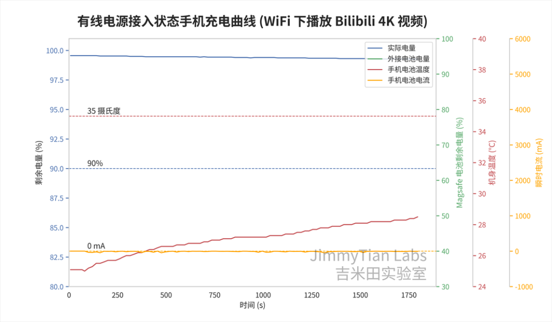 有线测试中可以发现,虽然手机没在充电,但温度还是在缓慢提升的,这代表播放 4K 视频的发热已经超过了手机本身的散热能力,热起来只是时间问题。