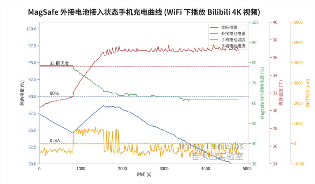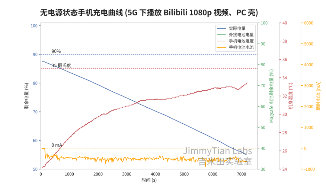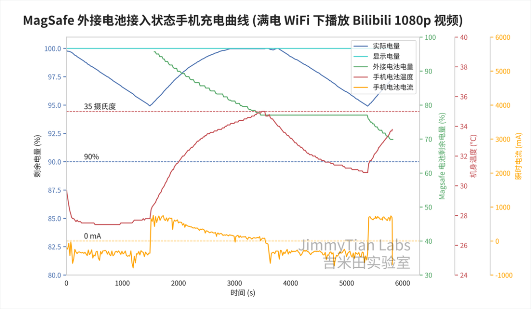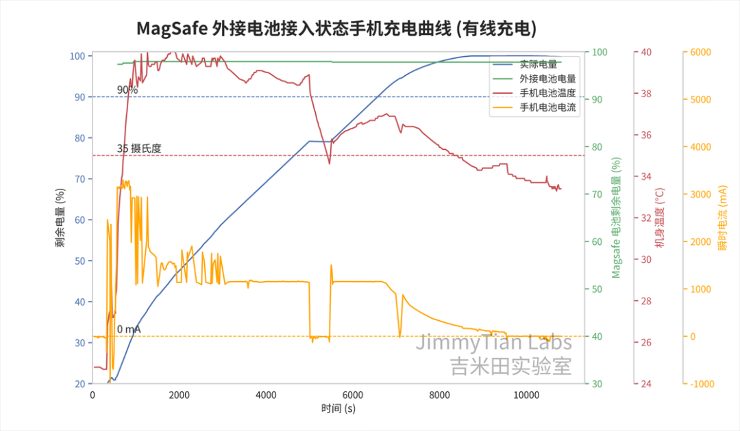,也没有通过电池的电流,那么有没有可能,当我们选择充电超过 90%,充满之后会直接从外接电池取电呢,再做一次测试。