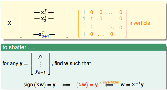 shatter的本质是假设空间H对X的所有情况的判断都是对的,即总能找到权重W,满足X∗W=y,。由于这里我们构造的矩阵X的逆矩阵存在,那么d维的所有inputs都能被shatter,也就证明了第一个不等式。