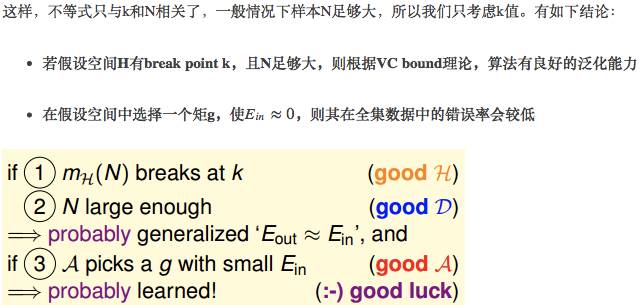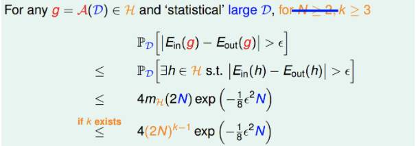 首先,我们知道如果一个假设空间H有break point k,那么它的成长函数是有界的,它的上界称为Bound function。
