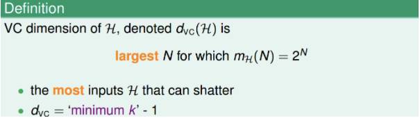 VC Dimension就是某假设集H能够shatter的最多inputs的个数,即最大完全正确的分类能力。(注意,只要存在一种分布的inputs能够正确分类也满足)。