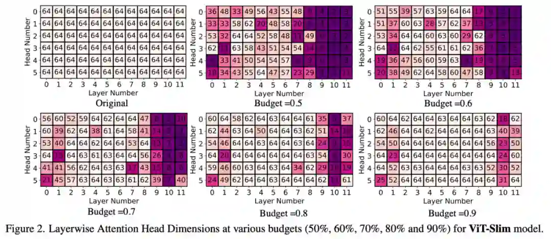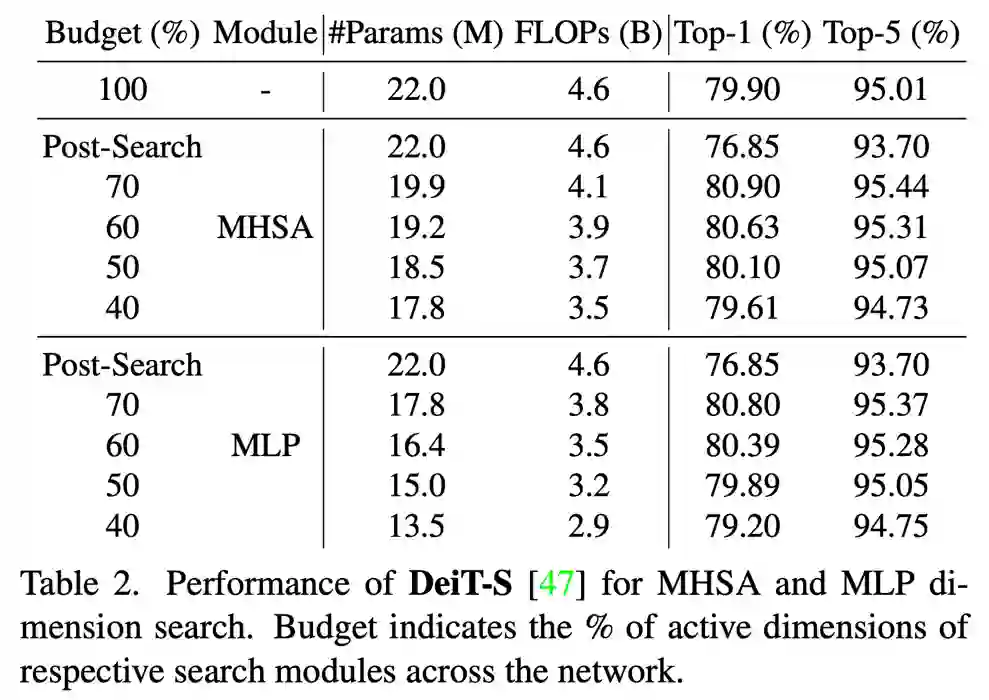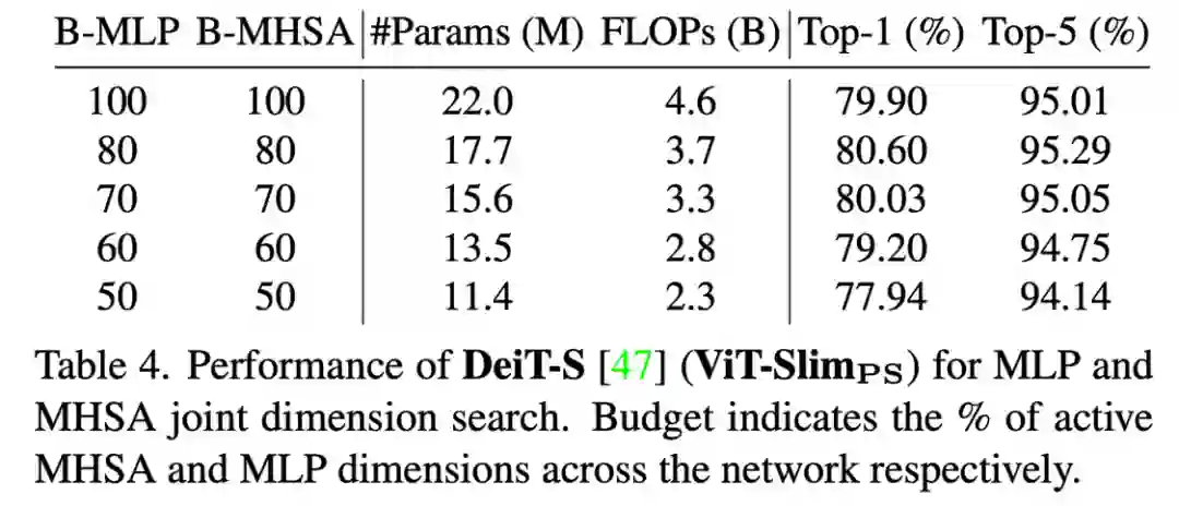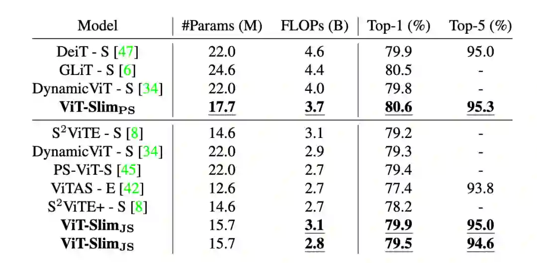 可以看出在更少的参数及计算量的条件下,ViT-Slim 可以得到更好的性能。