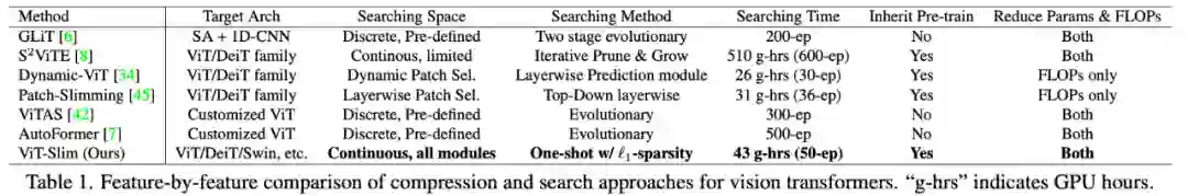 下面是 ViT-Slim 跟其他一些 ViT 压缩或者瘦身方法的区别,主要在于搜索方法以及使用范围的不同。
