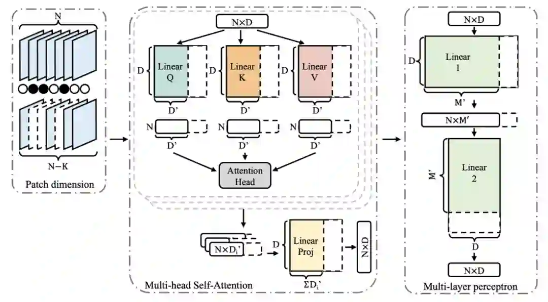 ViT Slimming 同时考虑了 ViT 里面三个模块:输入 tokens,MHSA 和 MLP 模块,它的训练过程可以看成是一个基于权重共享的子网络搜索过程,主干网的权重可以通过加载预训练好的模型参数来加快搜索。训练过程中 soft mask 接近 0 对应的特征相当于动态地被裁剪 / 丢弃了。该方法的优点是只需训练 / 搜索一次,就可以通过排序 mask 得到无数个子网络,非常高效灵活。算法优化函数由原始的 cross-entropy 和