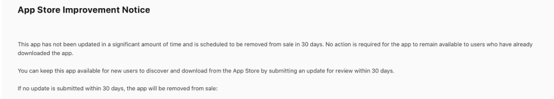 直到近日,Robert Kabwe 收到了苹果的邮件提醒,意思是“给你 30 天的时间,请对 App 进行版本更新,否则将会下架。”