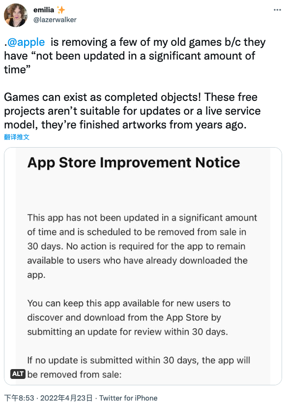 另一位开发者 Emilia 表示,“苹果正在删除我的一些旧游戏,只因它们没有在一定时间内进行更新。”在 Emilia 看来,游戏可以作为已完成的对象而独立存在于 App Store 中。这些免费的项目不适合经常更新或者以 Live Service 模式(一种“游戏服务”,即在游戏本体发行后,为其制定长期的DLC支持计划,吸引玩家回归或保持游戏热度的一种运营方式)。