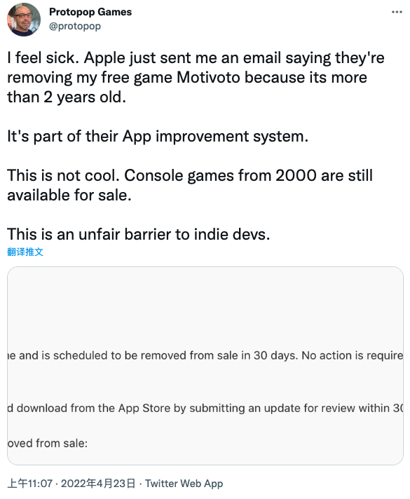 “我觉得很恶心。苹果刚刚给我发了一封邮件,说他们要删除我的一款免费游戏——Motivoto,只因为距离它上一次更新时间已经超过两年。”