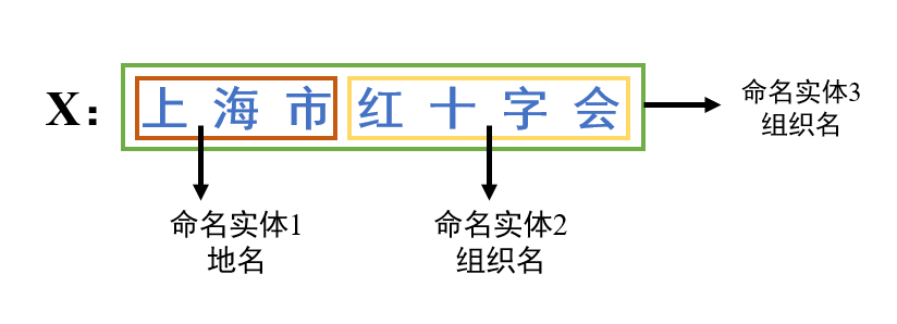 具体来说,如下图(1)所示:“上海市红十字会”就是一个典型的包含嵌套命名实体的例子。其中“上海市”是地名、“红十字会”是组织名、“上海市红十字会”是组织名且嵌套了上述两个命名实体。