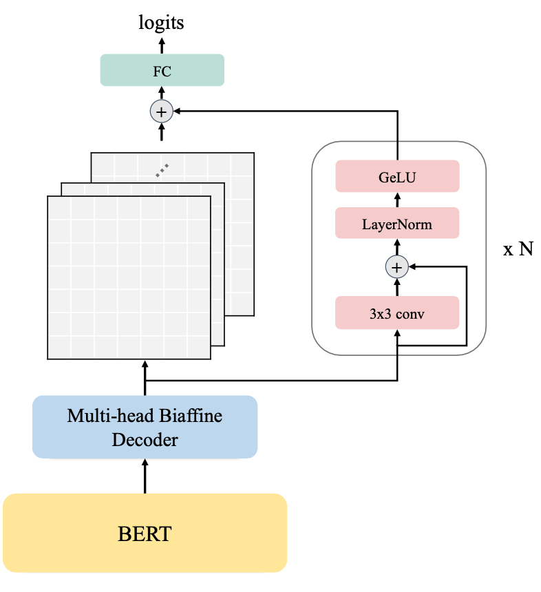 首先使用编码器(Encoder)如 BERT 对输入序列进行编码。在通过 BERT 等编码器获得了上下文有关的词嵌入(embedding)后,过去的工作通常会将其与静态的词嵌入以及字符级别的嵌入拼接起来并送入 BiLSTM 中获得聚合的词表示,但本文为了让模型架构比较简单,既没有采用更多的嵌入也没有额外引入 LSTM 层。