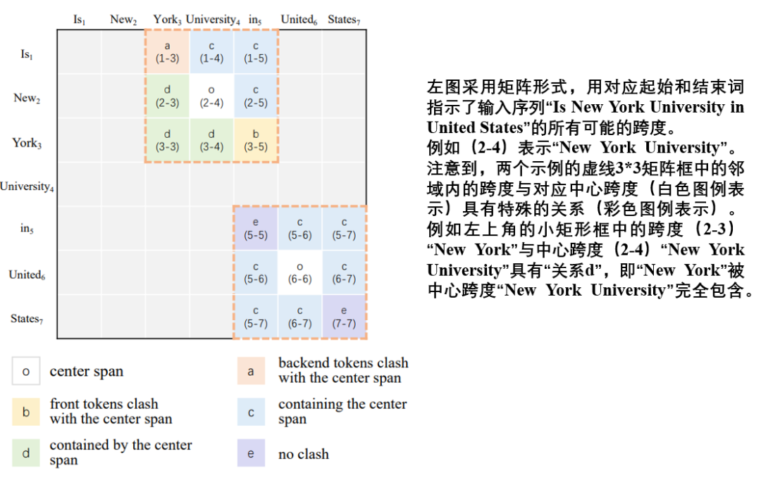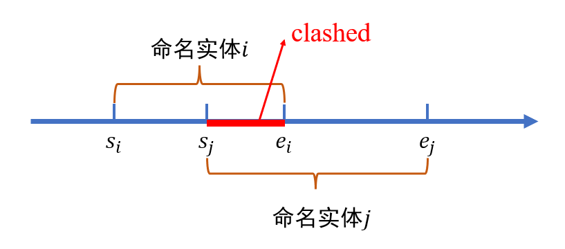 在嵌套命名实体识别任务中,虽然允许外层的命名实体嵌套内层的命名实体,但是并不允许命名实体之间的冲突(clash)。形象地说,就是不允许两个不同的命名实体之间首尾相交。