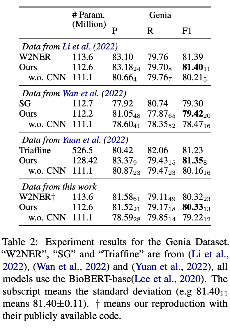 CNN-NER 采用 RoBERTa-base 作为编码器,分别在 ACE2004、ACE2005 数据集上取得了 87.31 和 87.42 的平均 F1 值;采用 BioBERT-base 作为编码器,在 Genia 数据集上取得了 80.33 的平均 F1 值。此外从实验结果来看,采用不同的分句方式进行预处理会影响模型的性能,因此作者开源了一个统一的预处理脚本,用于呼吁和促进今后的工作进行更方便、更公平的比较。