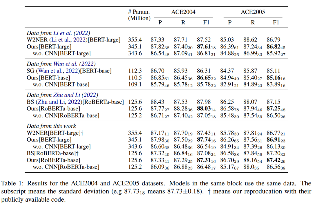 为了验证 CNN-NER 的有效性,作者在 ACE2004、ACE2005 和 Genia 这三个被广泛使用的嵌套命名实体识别数据集上进行了实验, 并采用常见的准确率(Precession)、召回率(Recall)以及 F 值(F-score)作为评价指标。作者选取了最新的一些论文中提出的模型,例如 W2NER、Span-level Graph、Boundary Smoothing 等作为基线(baseline),并且为了公平比较都各自采取了与对应论文完全相同的数据和预处理方式,并且均使用了相同的分句进行对比。