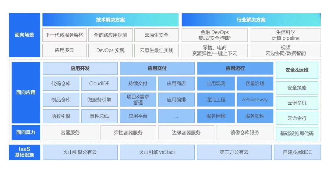 从底层说起,在 IaaS 层(公有云/私有云)之上,面向算力,火山引擎云原生提供容器、镜像层库、云原生监控等基础的容器服务,希望为公有云算力型客户提供更高效的资源调度能力,以节省企业成本;面向应用,在应用开发、敏捷交付、应用治理、Severless、多云管理等各方面,火山引擎云原生都提供了对应的开发/交付/治理等能力服务,为应用开发者提供更好的用云体验;再向上,面向场景,火山引擎希望推动云原生产品能力与差异化,依托自身实践打磨了场景化解决方案,另外针对金融、生信医疗、零售电商、工业等重点行业,火山引擎还推出云原生的行业级解决方案,希望通过定制 PaaS 做深行业云,此外产品矩阵中还有多个平台类生态产品,以及工具类解决方案。