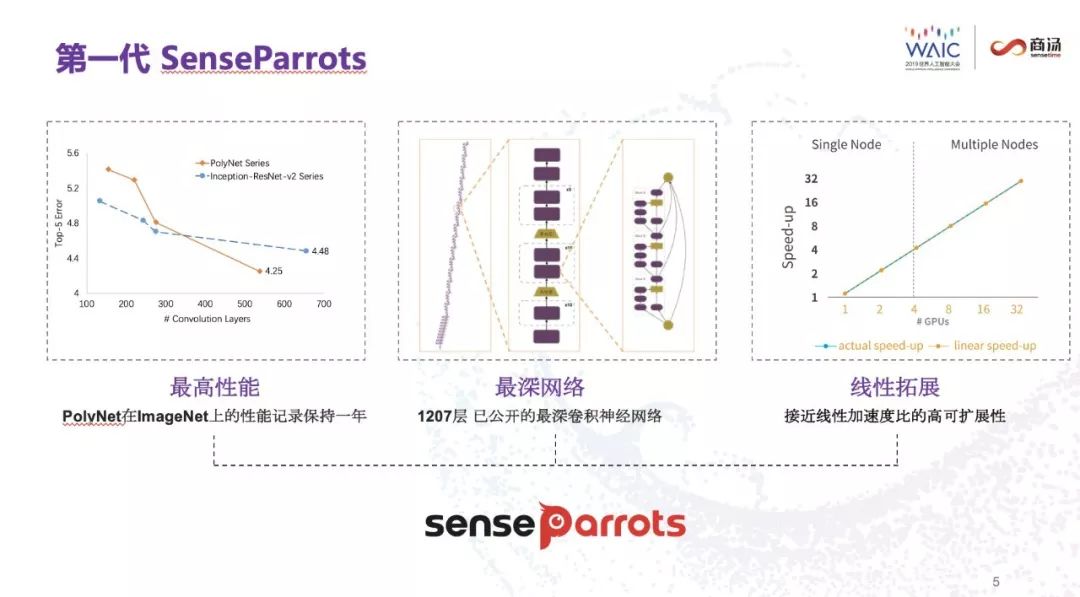 SenseParrots 在 2015 年出来的时候,已经具备了超越当时开源框架的卓越性能,它在业界率先实现了在 64 个 GPU 上接近线性的拓展。