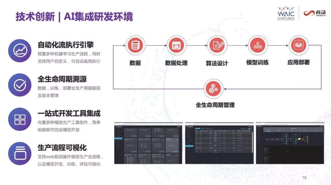 最后一个,这是一个上层应用框架,但是它对于提供 AI 研发的生产效率至关重要。正如刚才提到的,在工业化的 AI 生产环境里面流程非常复杂,需求多样。在这个时候,如果用传统的方式去运行整个 AI 研发的流程是非常低效的。所以我们也研发了这个 AI 集成研发环境,它具有全生命周期的管理能力,集成了很多模型生产的工具和组件,能够自动化地执行研发和业务流程。而且它为研究员提供了一个一站式的非常友好的研发环境,大大提高了他们的工作效率。