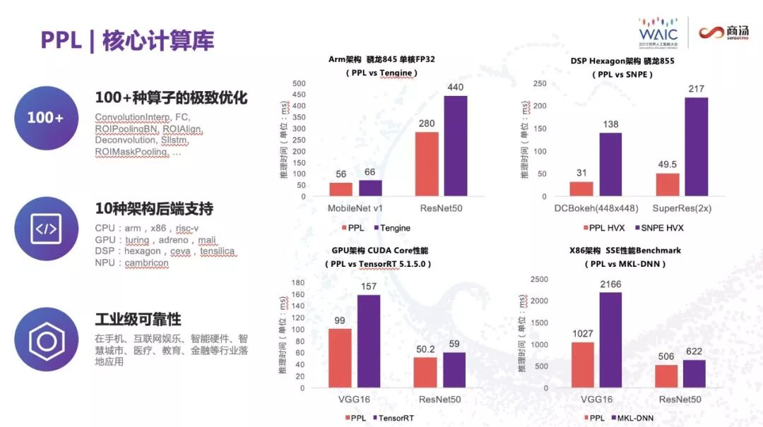 对每一个算子的具体执行,有一个我们自己研发的核心计算库 PPL(Parrots Primitive Library)。在这个计算库里面,我们对于超过一百个算子在十多种不同的架构上进行了极致的优化,它们支持了很多商汤业务里面非常重要的算子。