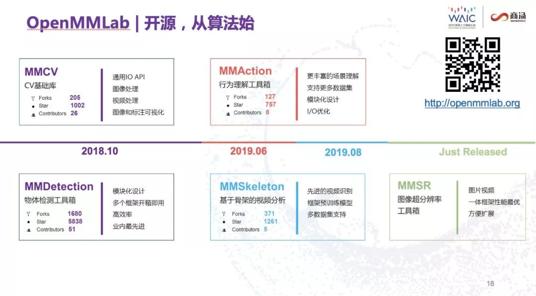 刚才提到了开源,我们已经有了实实在在的工作,以商汤的联合实验室 MMLab 开始我们逐渐把这几年积累下来的很多业界学界领先的算法开源出来,包括我们开源了 MMCV、MMDetection 等一系列的开源库,这些融会了商汤以及联合实验室过去几年研究的精华。