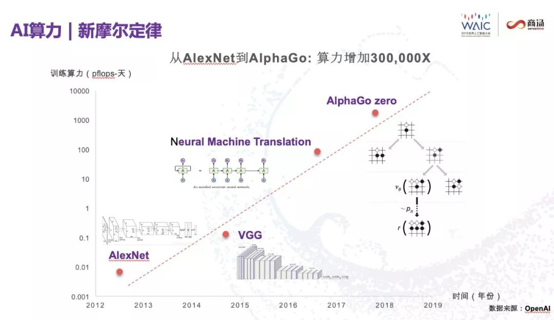 从 AlexNet 到 AlphaGo Zero,在短短的五六年时间里面,对算力需求增长了超过三十万倍,可以说这几年深度学习的成功,人工智能的爆发,在一定程度上就是把算力连接到有价值的产业应用所促成的结果。