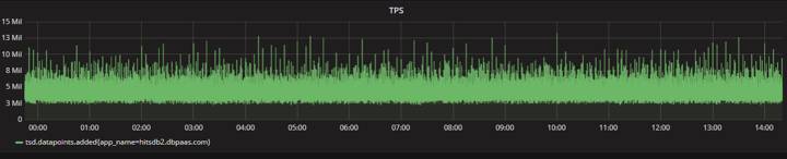 实时计算引擎使用了数据库总机器规模0.1%的资源,实现了全网秒级监控数据的计算,平均每秒处理超过1000万项性能指标,平均写入TPS 600万,峰值TPS 1400万,下图是双11期间HiTSDB TPS趋势曲线。