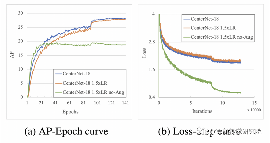 较大的学习速率不能帮助CenterNet更快地收敛,并且删除数据增强会导致性能变差。根据上面的结论,我认为这是因为CenterNet在训练过程中只在目标中心编码一个单一的回归样本。这种设计使得CenterNet在很大程度上依赖于数据增强和较长的训练时间,导致不友好的训练时间。