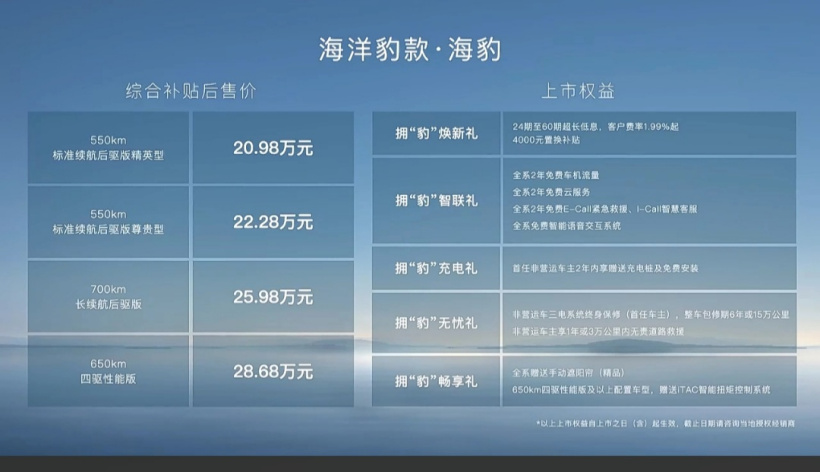 比亚迪海豹价格:550km 标准续航后驱精英 20.98 万元;550km 标准续航版后驱尊贵 22.28 万元;700km 长续航后驱版 25.98 万元;650km 四驱性能版 28.68 万元。
