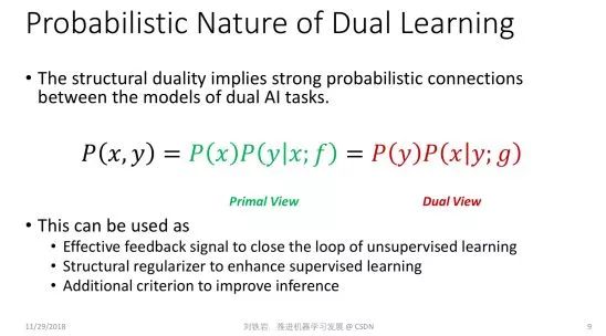 对偶学习背后其实有着严格的数学解释。当两个任务互为对偶时,我们可以建立如下的概率联系: