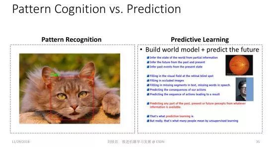 第三个方向关乎的是我们人类到底是如何学习的。到今天为止,深度学习在很多领域的成功,其实都是做模式识别。模式识别听起来很神奇,其实是很简单的一件事情。几乎所有的动物都会模式识别。人之所以有高的智能,并不是因为我们会做模式识别,而是因为我们有知识,有常识。基于这个理念,Yann LeCun 一个新的研究方向叫 Predictive Learning(预测学习)。它的思想是什么?就是即便我们没有看到事物的全貌,因为我们有常识,有知识,我们仍然可以做一定程度的预测,并且基于这个预测去做决策。这件事情已经比传统的模式识别高明很多,它会涉及到人利用知识和常识去做预测的问题。