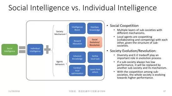 所以社会的多样性,社会竞争、进化、革命、革新,这些可能都是人类有今天这种高智能的原因。而这些东西在今天的机器学习领域,鲜有人去做非常好的建模。我们坚信只有对这些事情做了非常深入的研究,我们才能真正了解了人的智能,真的了解了机器学习,把我们的研究推向新的高度。