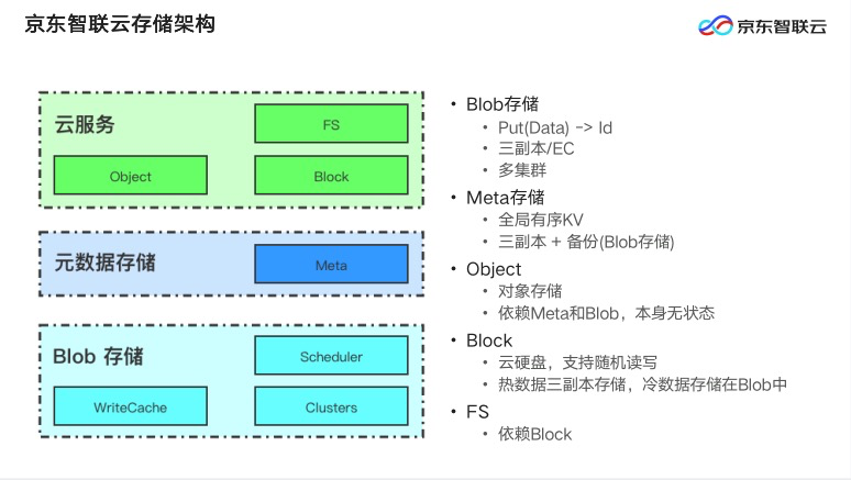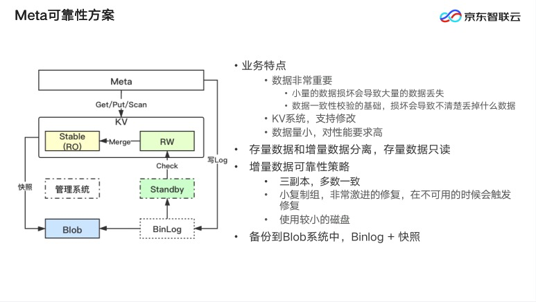 以上就是京东智联云在 Blob 系统中做的一些改变、优化措施,这也是京东智联云高可靠存储系统的核心部分,接下来简单的讲解下 Meta 可靠性方案和云硬盘的可靠性方案。