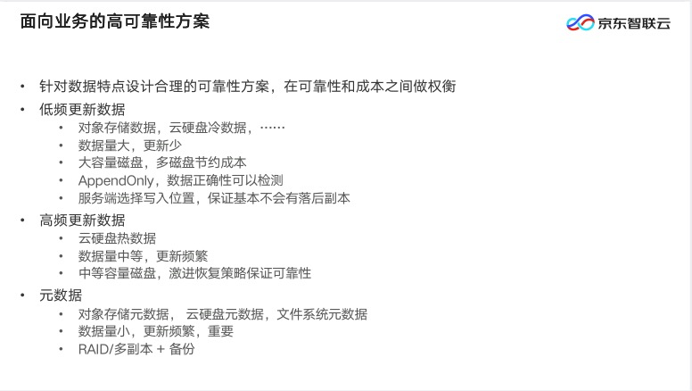 一般来说,可靠性都具有一个特点,即数据更新的越频繁,保证可靠性,需要花的代价就越大,所以京东会将数据进行分类,如上图所示第一类是低频更新的数据,如对象存储的数据,这些数据一般具有数量大,更新少的特点。