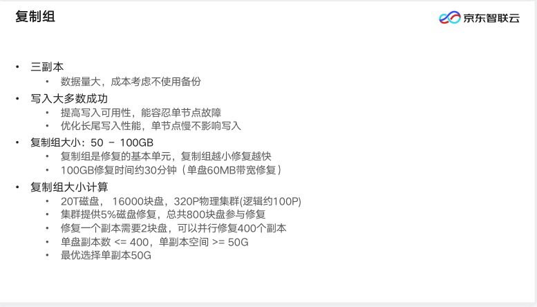 在复制组的选择上,会选择大小在 50 到 100GB 的复制组,范围的制定的上限是取决于修复时间,其下限是取决于集群做大的策略。在上限制定上,一个 100 个 GB 的复制组,如果是以 60MB 的速度修复,大概半个小时就能修复完了,而过大的复制组会导致修复时间变长,影响业务。复制组的下限如何计算呢,以实际为例,单盘大概 20T 一个集群,如果是 16000 块盘,就是一个常见的 320P 的物理空间,100P 逻辑空间的一个集群,如果整个集群中有 5% 的盘提供修复,相当于 800 块盘提供修复,每一个副本的修复需要两个盘支撑,通过这个计算能并行修复的副本的数量。一般并行修复的副本数量,应该和单机副本和单盘的副本数量是一致的,这也是达到一个最高的修复,根据这个算法,针对京东智联云一个有 20T 的盘,100P 的集群的系统,它的复制组应该是在 50G。