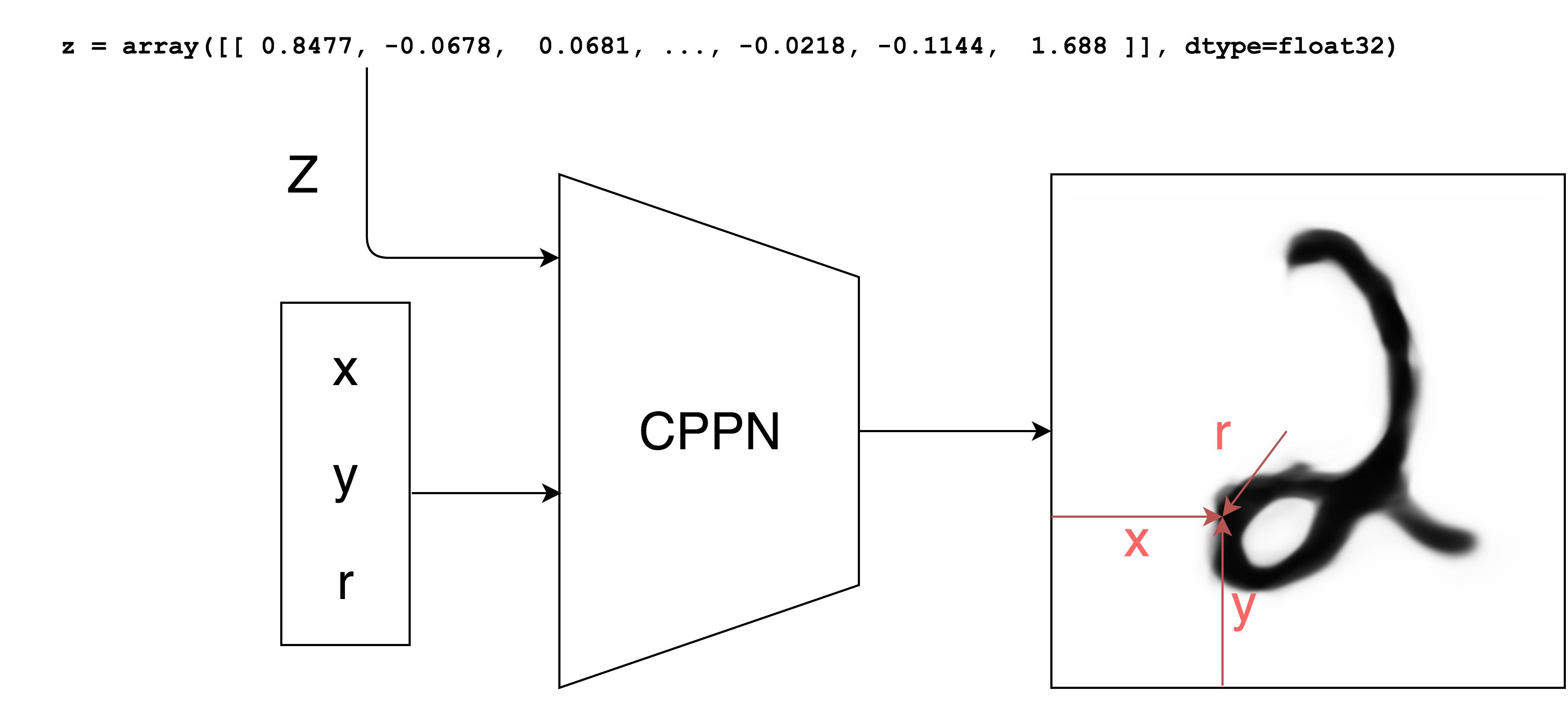 正如背景一节所讨论的,图像生成的挑战是得以对图像中的像素的联合概率分布进行建模。一旦我们有了所有像素逼真的概率分布,我们就可以从该概率分布中采样以生成逼真的图像。然而,由于真实图像非常复杂,人工建模概率分布太恶心了,所以诀窍在于使用神经网络将人类可理解的更简单的概率分布(如单位高斯随机变量)转化为与训练集中正常图像的真实概率分布类似的概率分布。生成概率分布的复杂性受限于神经网络架构的复杂性。在我们的例子中,生成图像的神经网络会是CPPN:
