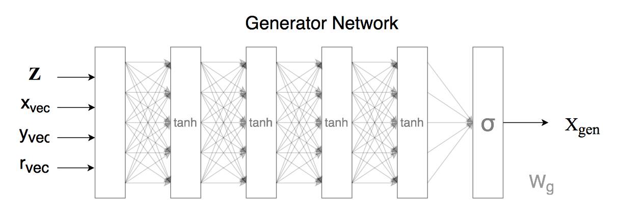 这个网络与上一篇文章中使用的网络属于一类。输入向量Z是从单位高斯随机数生成器中取得的32个实数组成的向量,这些实数均互相独立。向量x、y和r是我们想要计算的图像中的像素亮度的所有可能的坐标,因此对于26x26的图像,我们需要计算共计676个像素的亮度,以构成(32+676+676+676)个网络输入。有很重要的一点需要注意,每个像素强度将基于具有相同权重集合的完全相同的网络计算,所以如果内存有限的话,理论上我们也可以传给我们的网络(32+1+1+1)个输入并得到1个像素,在保持权重不变的前提下,重复这一步骤676次。