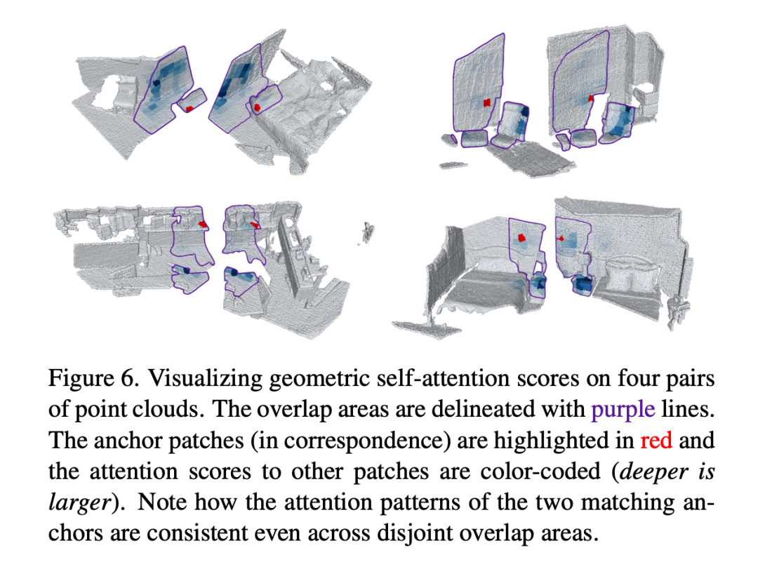 最后,我们还对我们的 geometric self-attention 的 attention score 进行了可视化,可以看到,即便是在 overlap 区域很小的情况下,对于匹配的super point/patch,我们的方法依然能够学习到非常一致的 attention score,这也证明了我们的方法能够有效的学习到两个点云中的空间一致性信息,来帮助建立更好的 correspondences。