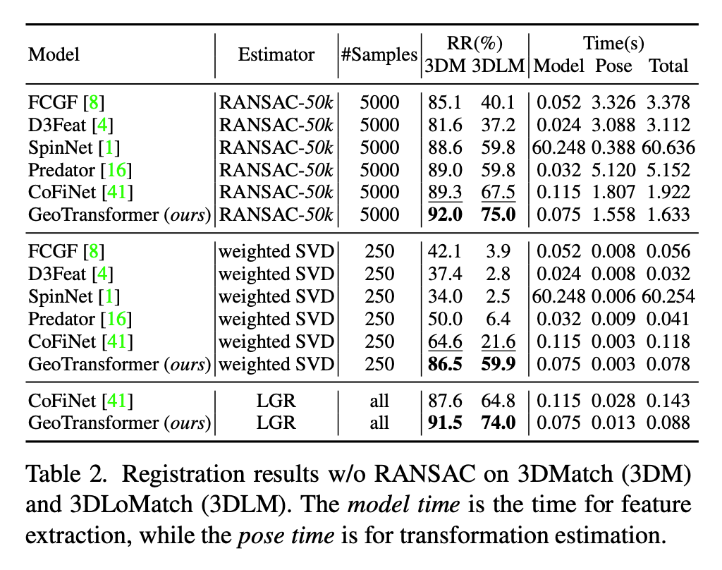 而在 Tab. 2 中,在不使用 RANSAC 或者 LGR,仅仅使用 weighted SVD 计算 transformation 的情况下,得益于我们的高质量 correspondences,我们的方法能够得到与 PREDATOR 相近的精度;而在使用 LGR 得情况下,GeoTransformer 则能够实现与 RANSAC 几乎相互的配准精度。