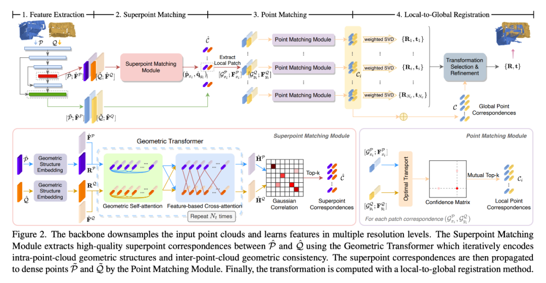 GeoTransformer 的整个算法分为四个部分。首先,对于输入点云,GeoTransformer 通过一个 KPConv backbone 来提特征。我们把最后一个分辨率下的点云所谓 superpoint,并通过 point-to-node 划分把每个点分配给最近的 superpoint,将 superpoint 扩展成 patch。