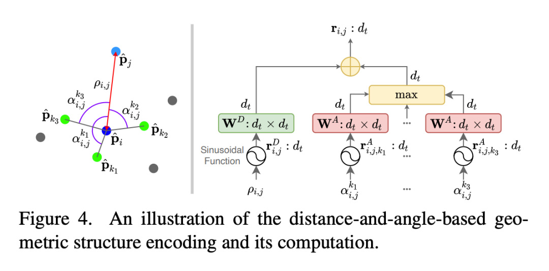 之后,我们通过 superpoint matching module 来提取 superpoint correspondences。在 superpoint matching module 中,我们使用了 self-attention 和 cross-attention 来进行点云内和点云间的特征学习。为了对点云的全局结构信息进行编码,我们设计了一种 geometric structure embedding,将 superpoint 之间的距离和角度信息引入到 self-attention 的计算中,我们把它称为 geometric self-attention: